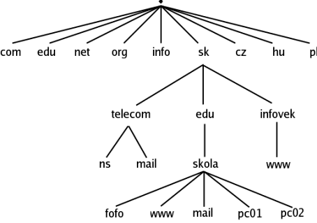 pod ní jsou TLD (Top Level Domain) (com, net, cz, …)